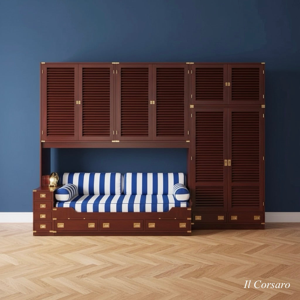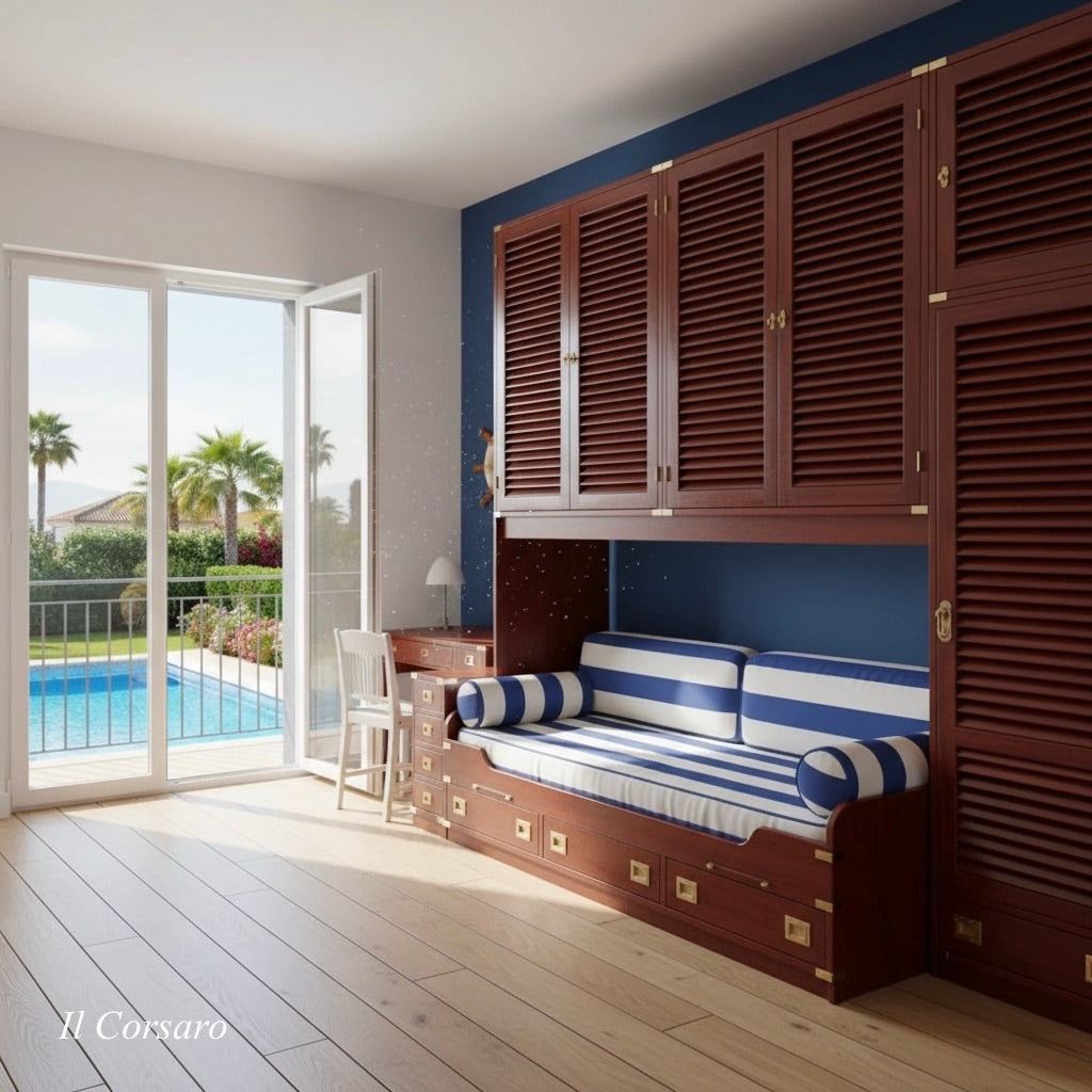 Il Corsaro propone questa cameretta stile marina realizzata in legno di mogano.